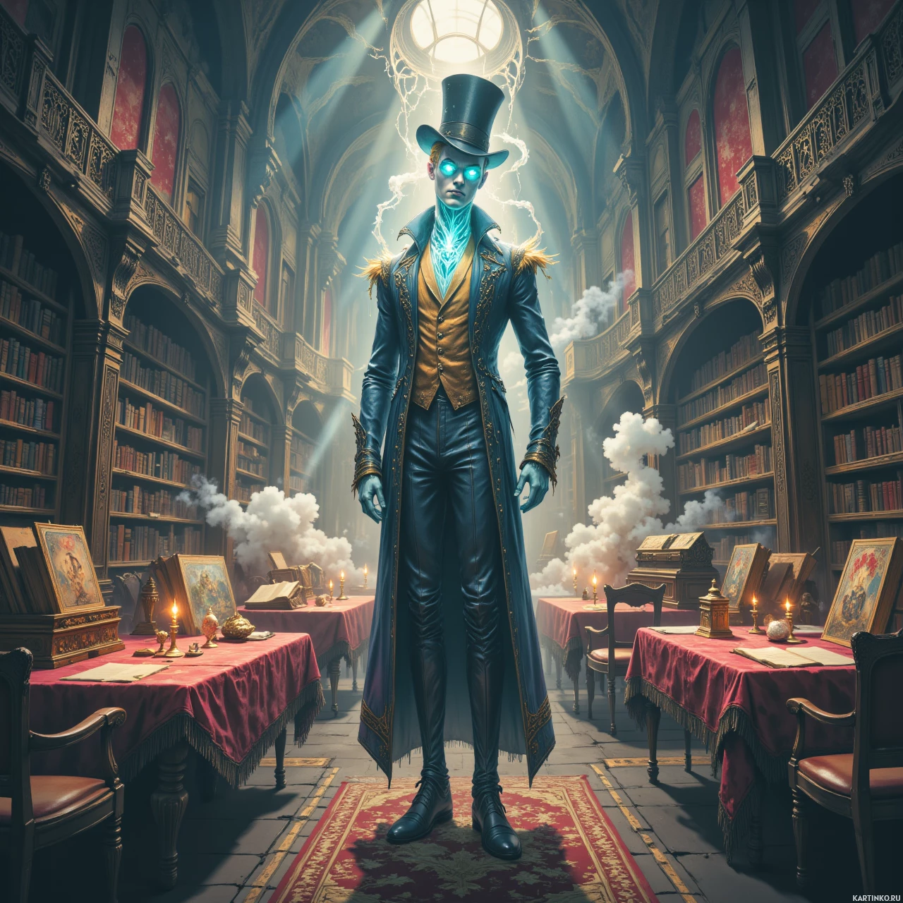 На картинке изображен персонаж, словно из мира фэнтези. На нем вычурный костюм, включающий цилиндр и длинный плащ с замысловатым узором на рукавах. Цветовая гамма костюма темная, контрастирующая со светлой кожей. В одной руке он держит трость. Персонаж стоит в роскошной комнате, похожей на библиотеку или кабинет, судя по множеству книг и свитков на полках и столах. Комната слабо освещена свечами, что придает обстановке мистическую атмосферу. Рядом с потолком виднеются легкие клубы дыма, добавляющие драматизма и загадочности. Поза персонажа выражает уверенность: одна рука лежит на бедре, а другая приподнимает часть плаща. В целом, впечатление такое, будто это сцена из фэнтезийной видеоигры, фильма или иллюстрации к книге, где персонаж может быть изображен как ученый, маг или некая влиятельная фигура в повествовании.