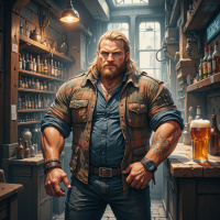 На картинке изображен мужчина, стоящий в старинной таверне или баре. На нём коричневая куртка с множеством карманов, что говорит о его склонности к приключениям и прочному укладу. Руки скрещены на груди, на лице серьёзное выражение, будто он готов к действию или столкновению. За его спиной – полки, заполненные бутылками с алкоголем: виски, бренди и другие напитки. Свет приглушённый, освещение создают подвесные лампы, что придает сцене особую атмосферу. На стойке, перед ним, стоит кружка с замерзшим стеклом – возможно, он собирается выпить или уже наслаждается напитком.