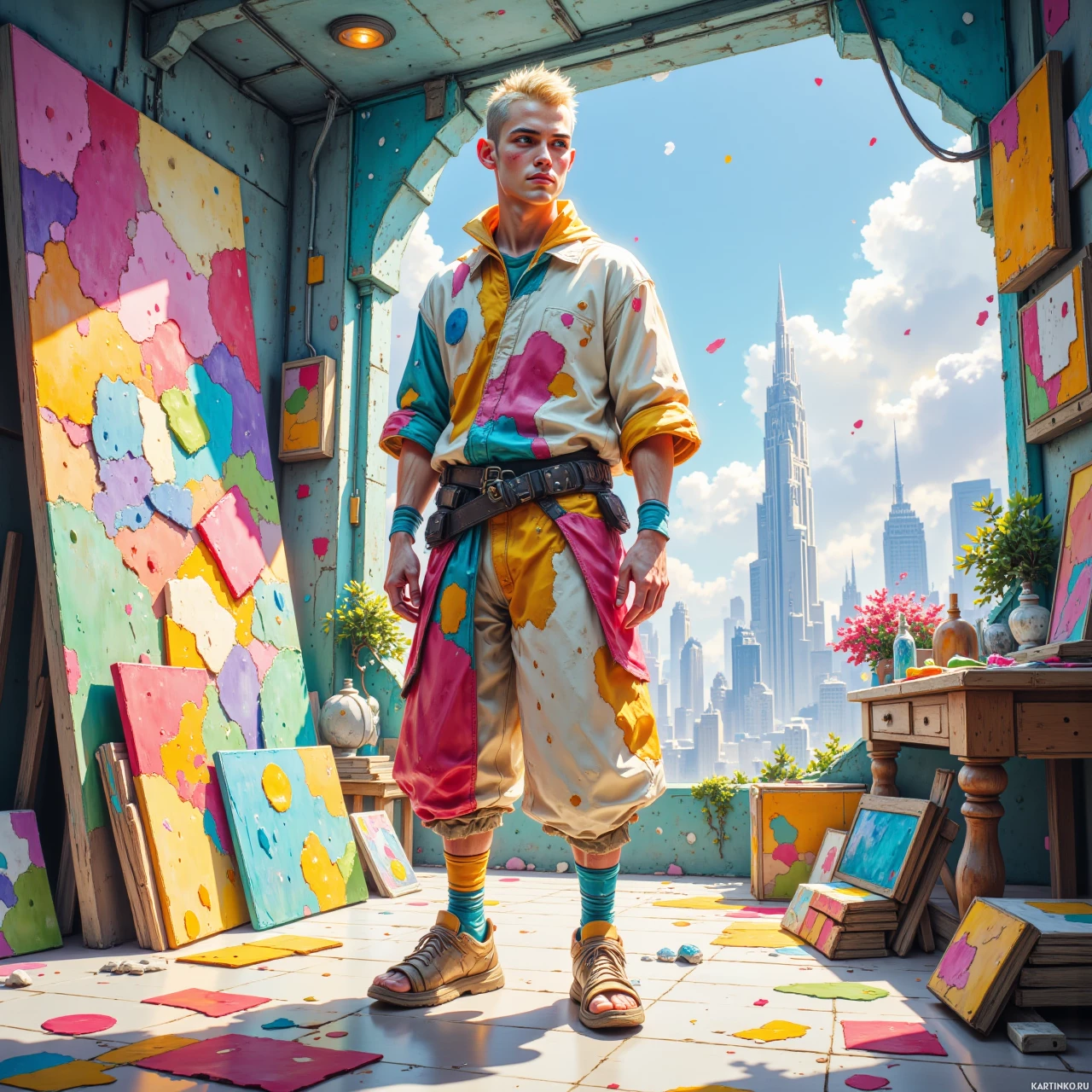 The image depicts a stylized, vibrant scene that seems to be inspired by a futuristic or fantasy setting. At the center of the image is a man standing inside an art studio with a large open window showing a view of a colorful cityscape featuring iconic landmarks like the Eiffel Tower and the Space Needle, which are often associated with famous cities such as Paris and Seattle respectively. The man appears to be an artist or a creative individual, given his attire and the surroundings. He's wearing a colorful outfit that resembles traditional East Asian clothing, possibly inspired by Japanese fashion. His hair is dyed blonde, and he has a thoughtful expression on his face as he gazes into the distance. The room itself is filled with art supplies and works of art. There are several paintings hanging on the walls, each exhibiting a different color scheme ranging from bold to pastel tones. There's also an easel with what appears to be a partially completed painting, suggesting that the artist was in the middle of his work when the image was captured. The use of bright colors and the artistic nature of the setting contribute to a whimsical and imaginative atmosphere, which might indicate that this scene is from a video game or a piece of concept art for such a medium. The blend of futuristic elements with classic architectural styles creates an intriguing juxtaposition that adds depth to the image.