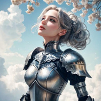 suit of armor that includes a helmet, gauntlets, and boots, all in shades of gold or silver. Her attire suggests she might be a warrior or a knight. The background has elements such as