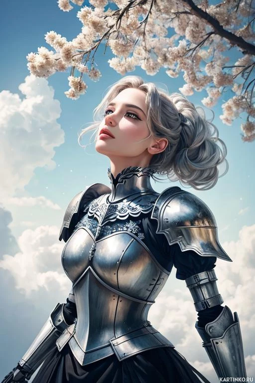 cherry blossoms, indicating an outdoor, possibly spring setting, with pink clouds adding a whimsical touch to the scene.