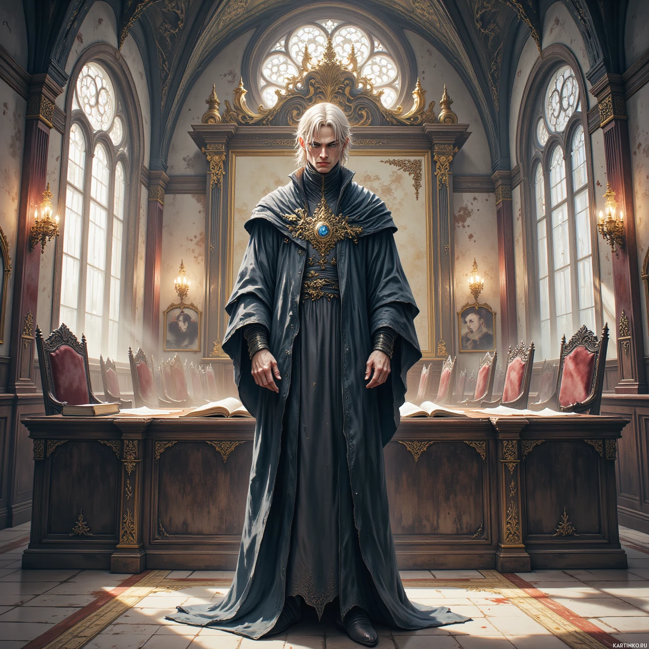 На картинке изображён персонаж, стоящий в богато украшенном помещении, пропитанном духом старины или истории. Это мужчина, одетый в сложный наряд: длинный тёмный робе с тяжёлой золотой отделкой и украшениями, включающими воротник-стойку и большой, детализированный золотой знак или медальон на груди. Его волосы аккуратно зачесаны, а на лице – суровое выражение. Комната оформлена в готическом стиле: стрельчатые арки, витражные окна со сложными узорами, высокие потолки. На стенах висят портреты исторических деятелей или представителей знати, что добавляет ощущения придворной или аристократической обстановки. Персонаж расположен в центре комнаты, стоя за столом или письменным столом, находящимся под одним из окон. В целом, атмосфера картинки передаёт сцену из фэнтези, исторической драмы или видеоигры в средневековом или эпохи Возрождения стиле.