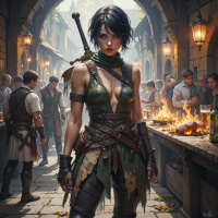 In the image, we see a woman standing in a bustling tavern. She is dressed in medieval attire that suggests she might be a warrior or adventurer. Her outfit includes a corset, armor pieces, and a sword slung over her shoulder. Her expression is serious, indicating focus or determination. The tavern around her is filled with various patrons engrossed in their own activities. Some are seated at tables, while others stand and mingle. The atmosphere suggests a lively scene typical of a medieval inn. In the background, you can see an outdoor area where people gather around what appears to be a fire, adding warmth and light to the setting. The image is rich in detail, capturing not only the woman's character but also the ambiance of the tavern and its patrons.