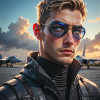 The image depicts a male character, who appears to be styled as a futuristic fighter pilot. He is wearing sunglasses and has a stern expression on his face. His attire includes a black jacket with silver accents, suggesting a high-tech or advanced design, likely indicative of a combat outfit. There are military aircraft visible in the background, reinforcing the character's role as a fighter pilot. The overall style of the image is digital art, and it has been rendered with a focus on realism with vibrant colors that give it an intense atmosphere.