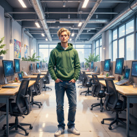 На картинке изображена комната, в которой человек сидит за столом. Судя по всему, он работает за компьютером, на мониторе которого отображаются различные графики и диаграммы, связанные с астрономией или космосом. За спиной у него несколько мониторов, показывающих схожую информацию. Комнату заполняют книжные полки с книгами и научным оборудованием, что указывает на исследовательскую или исследовательскую обстановку. В целом, картинка создает ощущение высокого уровня технологичности в сочетании с атмосферой спокойной сосредоточенности.