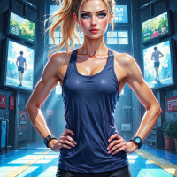 The image features a female character, who is blonde and has her hair pulled back. She is wearing athletic attire consisting of a sleeveless top and shorts. Her pose suggests she is confident or assertive. In the background, there are images or videos playing on monitors, depicting other individuals engaged in running activities, which might suggest a connection to sports or fitness themes. The overall style of the image appears to be digital art with vibrant colors and dynamic lighting that gives it a futuristic or energetic atmosphere.