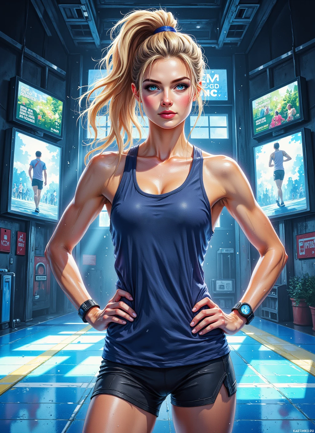 На картинке изображена девушка с блондинистыми волосами, убранными назад. На ней спортивная одежда: топ без рукавов и шорты. Её поза говорит о уверенности и напористости. На заднем плане – мониторы, на которых демонстрируются изображения или видео с людьми, занимающимися бегом, что, вероятно, указывает на спортивную или фитнес-тематику. Общий стиль картинки – цифровая живопись, выполненная в ярких цветах, с динамичным освещением, создающим футуристичную и энергичную атмосферу.