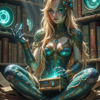The image depicts a fantasy-themed character who appears to be a young female with long blonde hair. She is wearing intricate, ornate armor and jewelry that seem to incorporate both traditional and futuristic elements. Her attire includes metal chest plates, mechanical components such as gears, and what seems to be a headpiece with lights or a halo effect. She is seated amidst an array of books and scrolls, which gives the impression that she may be in a library or knowledge repository. The lighting in the image is dramatic, highlighting her from the back, casting long shadows and creating a mysterious atmosphere. Her posture suggests she might be studying or contemplating something related to magic or ancient lore.