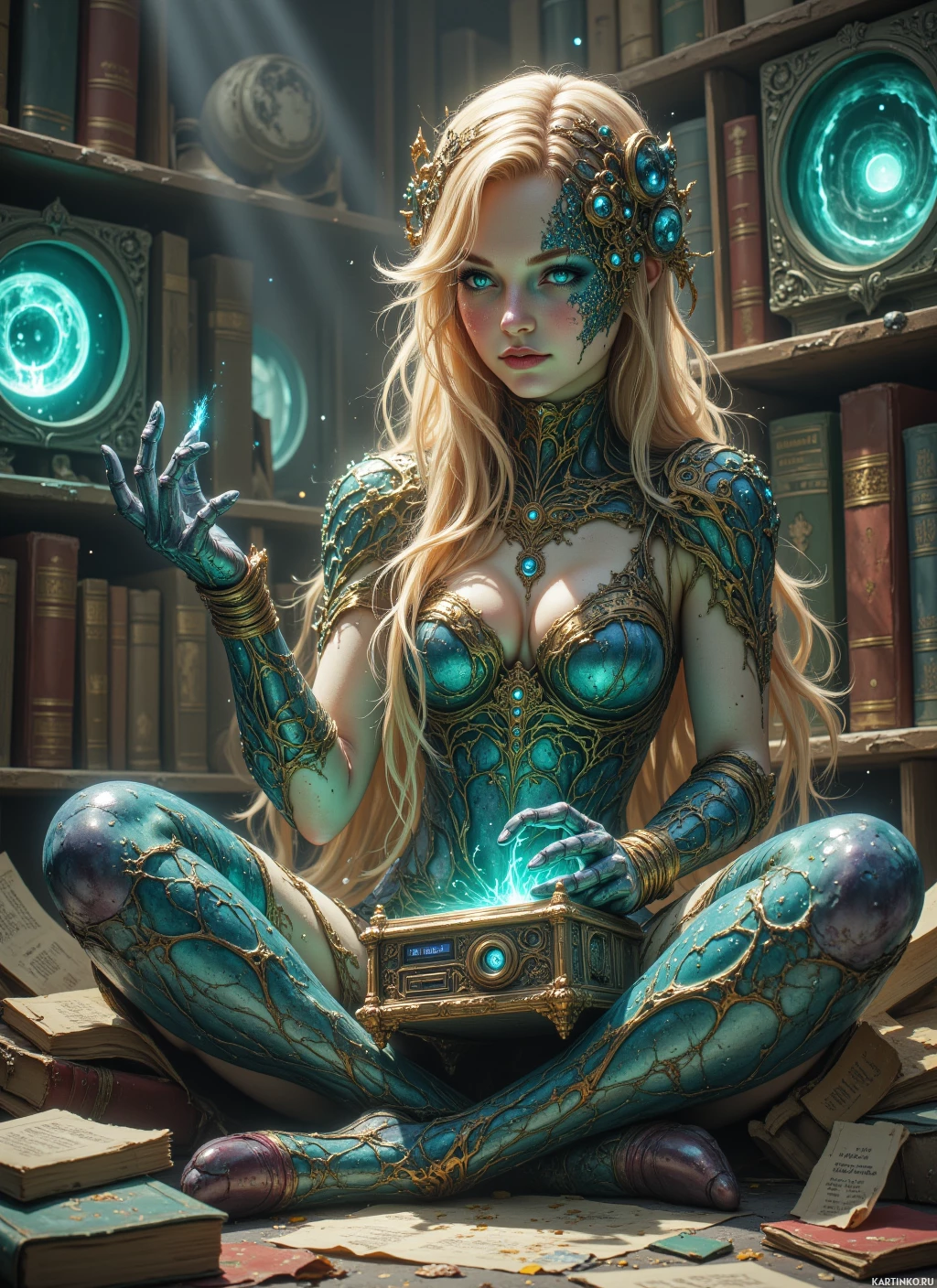 Картинка изображает персонажа в стиле фэнтези, похожего на молодую девушку с длинными светлыми волосами. На ней сложный, богато украшенный доспех и украшения, сочетающие в себе традиционные и футуристические элементы. В одежде – металлические пластины, механические детали, вроде шестеренок, и, кажется, головной убор с подсветкой или эффектом нимба. Она сидит среди множества книг и свитков, создавая впечатление, будто находится в библиотеке или хранилище знаний. Освещение в картинке драматичное, подсвечивающее её сзади, отбрасывая длинные тени и создавая таинственную атмосферу. Её поза говорит о том, что она, возможно, изучает или обдумывает что-то, связанное с магией или древними преданиями.