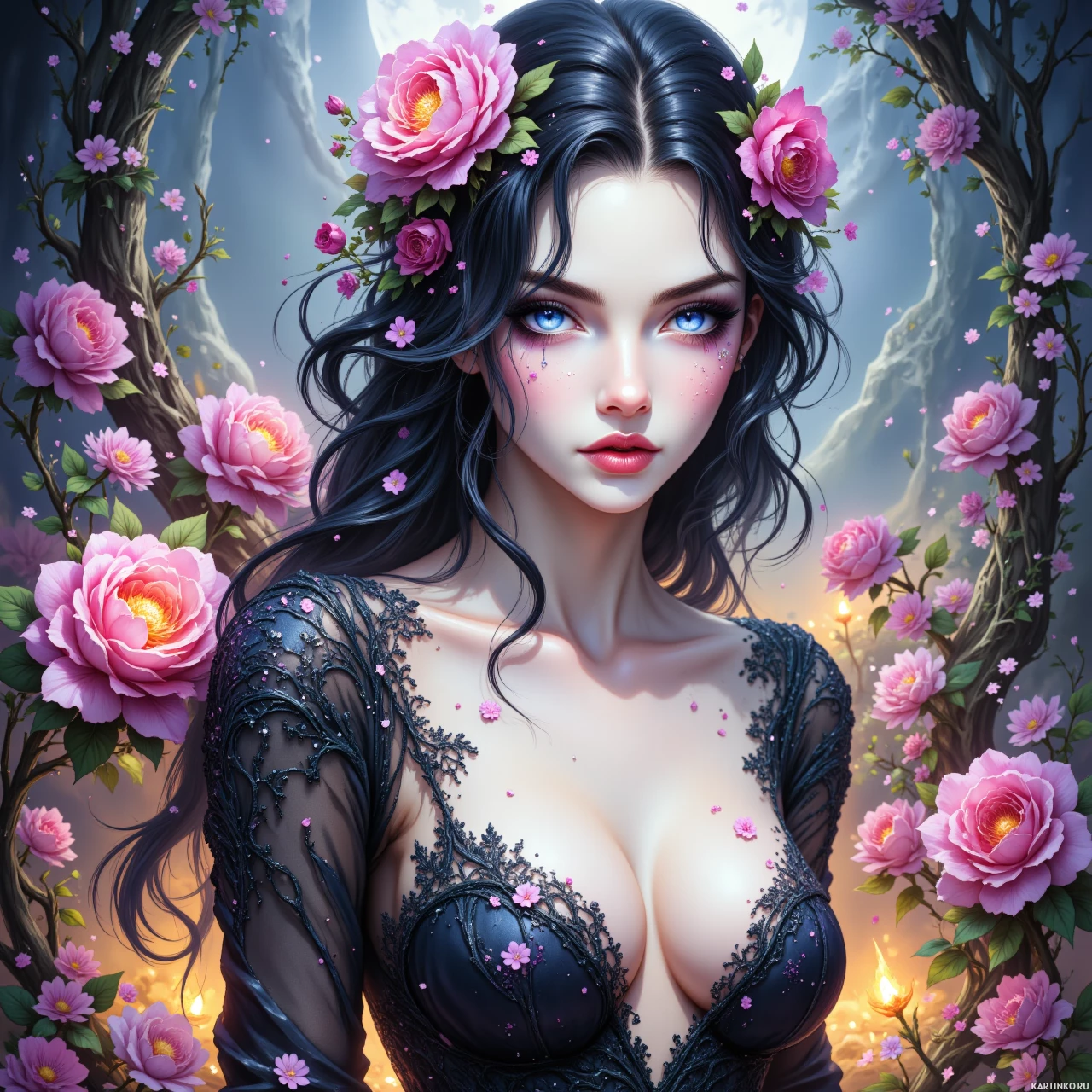 На картинке изображена девушка с каштановыми волосами, украшенная яркими розовыми цветами. У нее поразительные голубые глаза, и она одета в черное платье, декорированное сложным узором. Выражение ее лица немного задумчивое или меланхоличное.