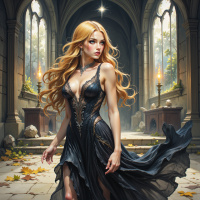 На картинке запечатлена женщина с длинными светлыми волосами в роскошном черном платье с замысловатой отделкой. Она стоит в помещении, напоминающем готический или средневековый интерьер – на это указывают архитектурные детали вокруг неё: стрельчатые арки и витражи, через которые проникает естественный свет. Общая атмосфера картинки – таинственная и царственная.