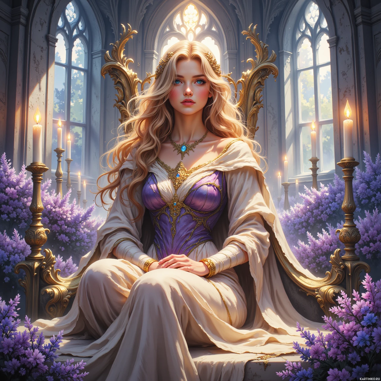 Картинка изображает стилизованное, анимированное изображение молодой женщины с длинными светлыми волосами и голубыми глазами. На ней фиолетовое платье с замысловатыми украшениями, отсылающими к средневековой или фэнтезийной тематике. Действие происходит в роскошном зале с богатым архитектурным оформлением: витражные окна, высокие потолки, сложная декорация. По всей сцене разбросаны горящие свечи, создающие атмосферу величия и, возможно, праздничного или церемониального события.
