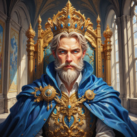 На картинке изображён персонаж, похожий на короля или представителя знати. У него седая борода и он одет в роскошный королевский наряд, включая синий плащ с замысловатым орнаментом и золотую корону на голове. Выражение его лица говорит об авторитете или задумчивости. За ним виден богато украшенный трон на фоне того, что похоже на интерьер замка со витражами. В целом, картинка создает впечатление фэнтезийной или исторической обстановки, возможно, из видеоигры или произведения фэнтези.