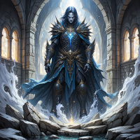 The image depicts a fantasy scene featuring an armored figure at the center. This figure appears to be male and is dressed in elaborate, ornate armor that suggests a medieval or otherworldly setting. His attire includes a helmet with pointed ears and an intricate design on the forehead, a cape, and plated armor with large shoulder guards and what seem to be magical symbols or glowing accents. The character is standing within what appears to be a Gothic architectural setting, possibly a chapel or temple, given the arched doorways in the background. The interior has stained glass windows that suggest a religious or sacred function. There are also elements of magical energy or essence surrounding the figure and the ground beneath him, which is a common trope in fantasy art to indicate magic or supernatural power. The overall style of the image is digital art, known for its vivid colors and high level of detail. The atmosphere created by the combination of architecture, armor, and magical elements evokes a sense of otherworldly majesty and power.