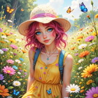 In this picture, there is a girl with pink hair wearing a yellow dress. She has on her head a straw hat adorned with blue flowers. The girl is posing among a field of colorful wildflowers, including daisies and marigolds. There are also butterflies fluttering around her, adding to the whimsical atmosphere. The overall mood of the image is cheerful and vibrant.