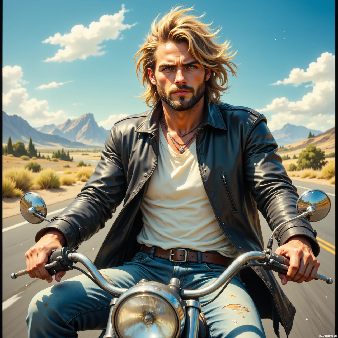 На картинке запечатлен мужчина, едущий на мотоцикле. У него длинные волосы и борода, что придает ему мужественный вид. Он одет в повседневную одежду, включая кожаную куртку, подчеркивающую его байкерский стиль. Фон – пустынный пейзаж, что говорит о том, что фотография могла быть сделана во время экспедиции или путешествия по отдаленной местности. На заднем плане видны горы и чистое небо, что указывает на засушливый климат. Мотоцикл занимает важное место на переднем плане картинки, а мужчина сидит на нем, уверенно глядя вперед, будто прокладывая свой путь.