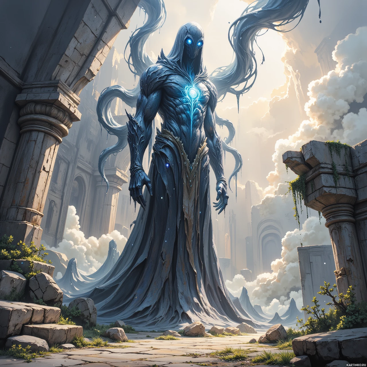 Картинка изображает фантастическую сцену. На переднем плане – фигура, похожая на человека, с длинными развевающимися белыми волосами и плащом, колышущимся за ней. Фигура производит впечатление величия, стоя перед монументальной каменной конструкцией или руинами. Одежда фигуры проработана до мелочей, с замысловатыми узорами и деталями, указывающими на значимость персонажа в контексте истории. На заднем плане – неземная атмосфера, возможно, храм или гробница, расположенные в мистическом пейзаже. Видны массивные каменные сооружения с колоннами и арками, подчеркивающие величие окружения. Небо проглядывает сквозь просветы в архитектуре, намекая на необъятность сцены. Замечательно, что эта картинка может быть концепт-артом для видеоигры или иллюстрацией к книге, изображающей фантастический сюжет.