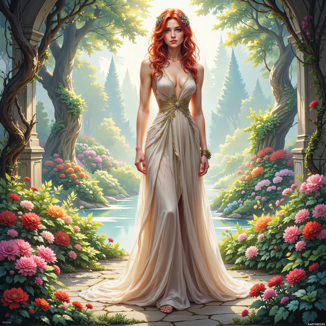 На картинке изображена женская персона, вероятно, из видеоигры или фэнтези. У нее яркие рыжие волосы, и она одета в длинное, изящное платье с золотыми вставками. Поза выражает уверенность и благородство. Вокруг – буйство красок: цветы самых разных оттенков создают пышный фон. Персонажка стоит между двумя арками, ведущими в сад, а сквозь листву деревьев пробивается солнечный свет, согревающий всю сцену.