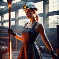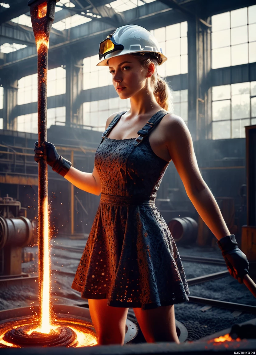 large windows. She is holding onto what seems to be a molten metal ingot or bar, possibly indicating that she's involved in the process of pouring or shaping metal. Her attire includes a protective dress, which matches her hard hat, and she is standing with one leg crossed over the other, adding
