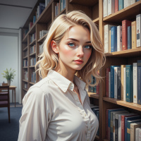 In this image, there is a young woman with blonde hair and striking blue eyes. She has a subtle makeup look that complements her natural beauty. Her gaze is directed slightly away from the camera, giving her an introspective appearance. The setting of the photo appears to be a library or study room, as evidenced by the bookshelves filled with books in the background. The lighting is soft and even, highlighting the woman's features without creating harsh shadows. The overall atmosphere of the image suggests a sense of calm and intellectual pursuit.