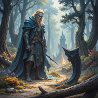 Картинка изображает фантастическую сцену с двумя мужчинами. Один одет в традиционные средневековые доспехи, с мечом и щитом у пояса. На нём длинный плащ, ниспадающий на землю позади. Его взгляд направлен вперёд, а осанка выражает готовность или ожидание. Второй мужчина сидит на поваленном бревне на переднем плане. У него есть борода, и он одет более непринужденно, чем его спутник. Он отворачивается от стоящего мужчины и смотрит в лес, где солнечный свет пробивается сквозь листву, создавая спокойную атмосферу, несмотря на присутствие рыцаря. Задний план - пышный лес, по которому видна тропа, ведущая к замку вдали, что добавляет общей мистической и сказочной тематике картинки.