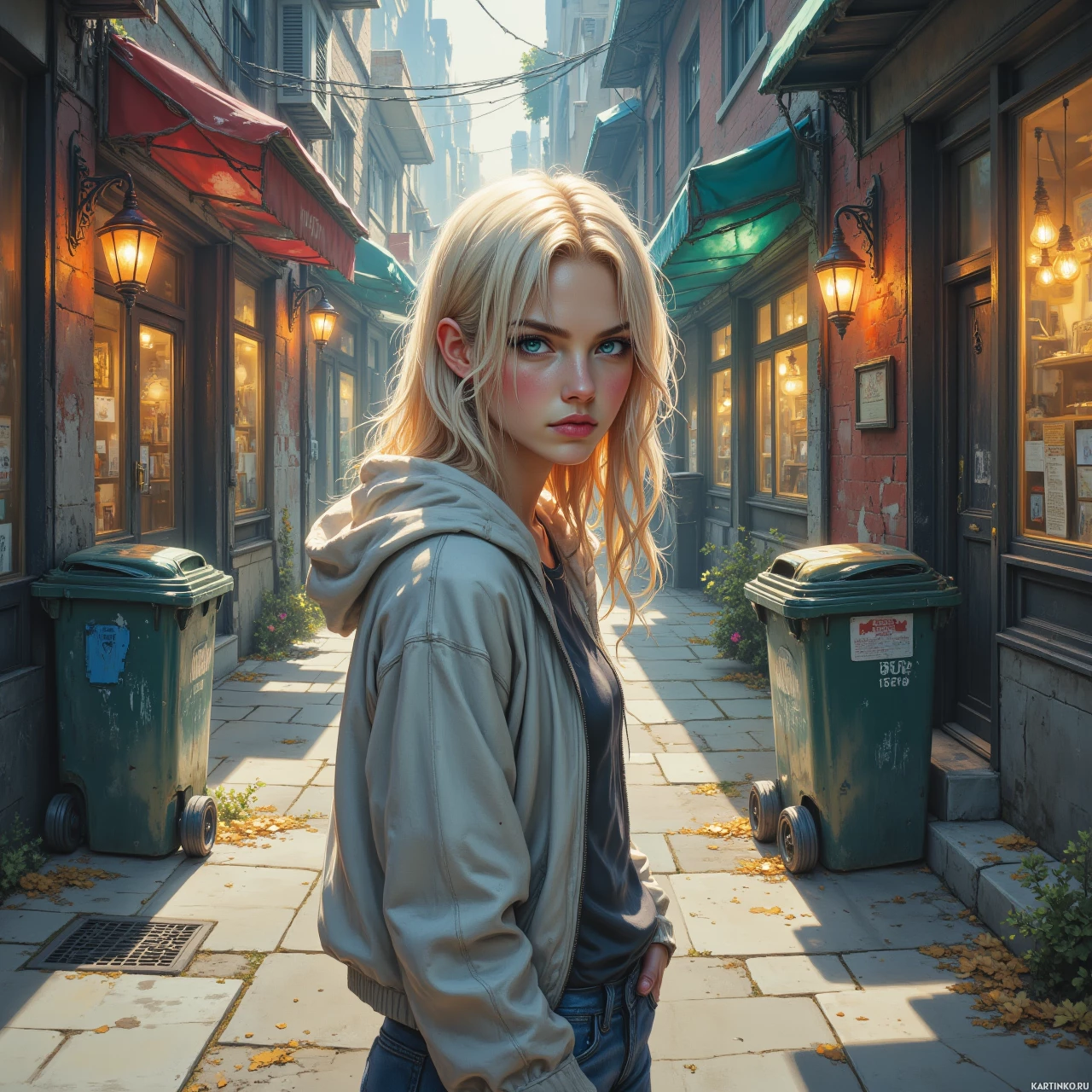 На картинке запечатлена молодая женщина с золотистыми волосами и пронзительными голубыми глазами. У нее светлая кожа, а взгляд направлен в сторону, что придает ей вид задумчивости или рассеянности. Она одета в бежевую куртку поверх черной водолазки и синие джинсы, что говорит о непринужденном, но стильном образе. Она стоит на узкой улочке, которая выглядит старинной, но ухоженной. Дома по обе стороны плотно прижаты друг к другу и обладают очарованием старины, намекая на место, насыщенное историей и колоритом. Яркие навесы добавляют красок в сцену, контрастируя с земляными оттенками кирпича и камня. В целом, картинка имеет кинематографичный вид, возможно, она является рекламным материалом для фильма или сериала с участием этой женщины. Освещение мягкое и равномерное, выделяя ее черты без резких теней, что создает спокойную и притягательную атмосферу.