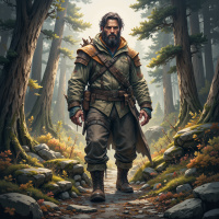 На картинке изображён мужчина, идущий по лесистой местности. На нём коричневая мантия, а за спиной колчан, что наводит на мысль о том, что он охотник или лучник. На лице – сосредоточенное выражение, и кажется, он направляется куда-то за пределы кадра. Вокруг него густой лес с деревьями и камнями, создающий ощущение дикой, нетронутой природы. В целом, картинка передаёт атмосферу приключений и исследований.