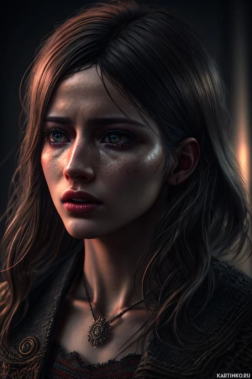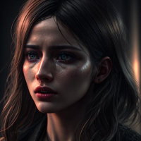 dark hair that appears to be wet, possibly suggesting she's been in water or it's raining. Her eyes are blue and her makeup is done in a way that emphasizes her