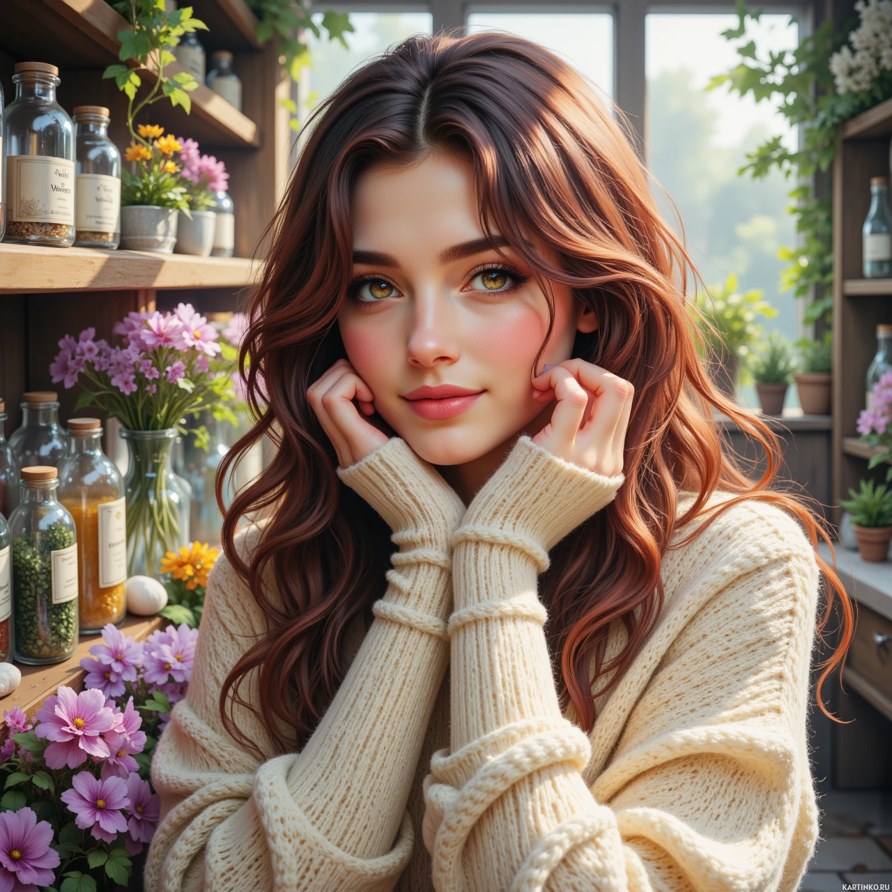 На картинке молодая женщина с длинными волнистыми каштановыми волосами и большими голубыми глазами. У неё светлая кожа, а макияж мягко подчеркивает её черты. Её выражение лица нежное, она смотрит в камеру. На ней светлый вязаный свитер, что намекает на прохладный климат или сезон. На заднем плане за ней видны полки с различными бутылками и контейнерами, предположительно, с травяными средствами или натуральной продукцией. Обстановка создает ощущение деревенского уюта, деревянные панели и растения добавляют зелени в кадр. Похоже, она может находиться в магазине трав или в месте, связанном со здоровьем и природой.
