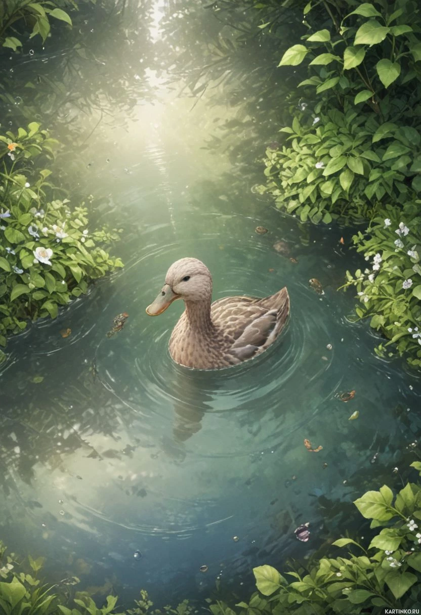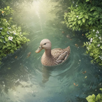 trees in the background, adding to the sense that this could be within a forest or a secluded garden. The colors are soft and pastel-like, contributing to a serene and peaceful atmosphere.