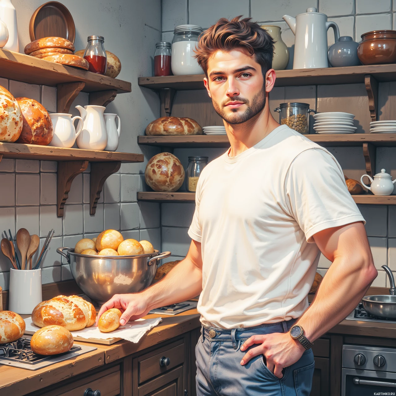 На картинке мужчина стоит, вероятно, в пекарне или на кухне. На нём повседневная одежда: белая футболка и джинсы. Он стоит, положив руки на бедра, и слегка улыбается, глядя в камеру. За его спиной – полки, заставленные бутылками, мисками и прочими кухонными принадлежностями. Перед ним – духовка, полная свежеиспечённых булок. Атмосфера указывает на профессиональную или коммерческую среду, связанную с приготовлением пищи.