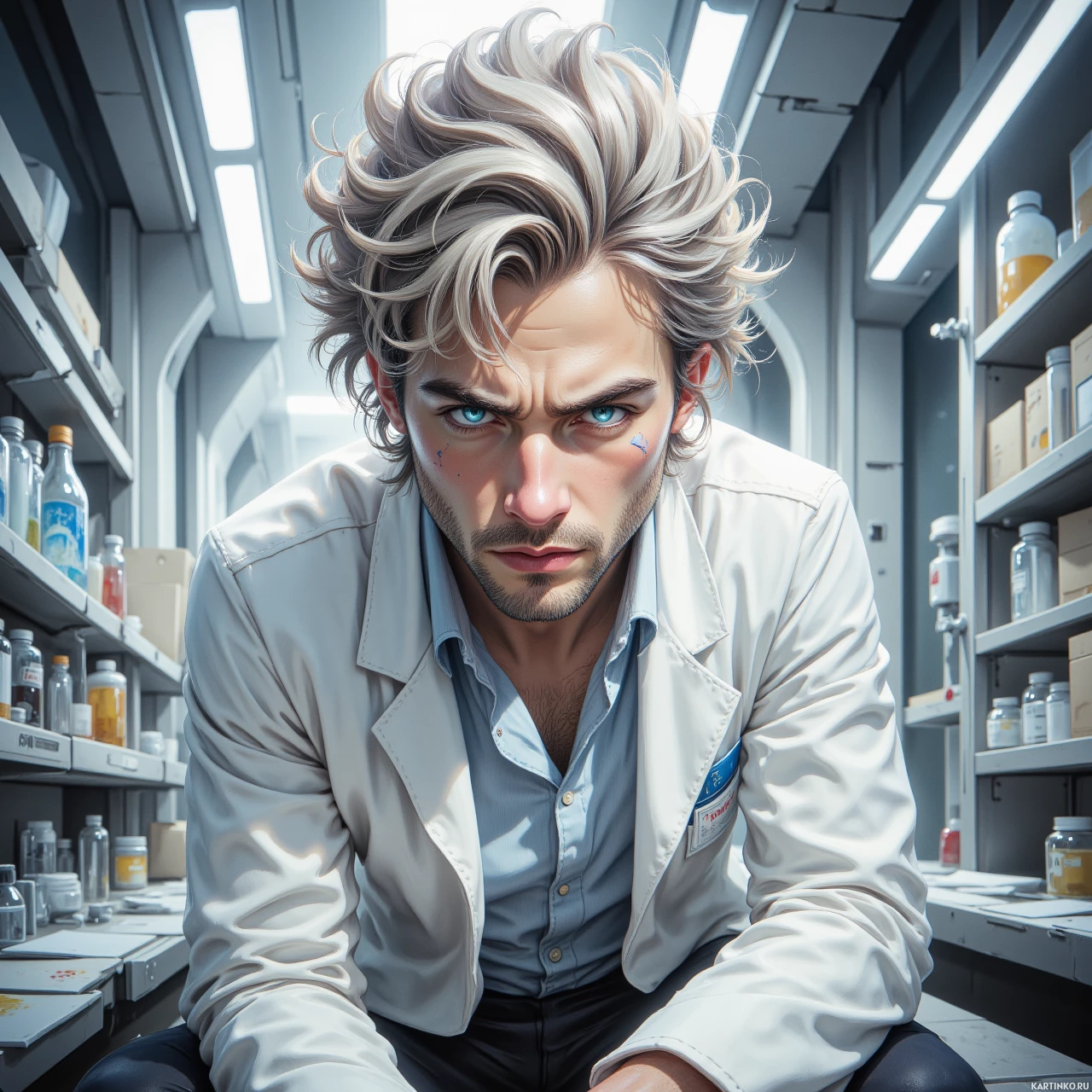 На картинке изображен молодой человек, примерно двадцати пяти лет. У него длинные уложенные волосы с синими кончиками, и на лице – выражение беспокойства. Взгляд направлен вперед, а на лице – серьезное выражение. Он одет в белый халат поверх темной рубашки, что может указывать на медицинскую или научную профессию. Кажется, действие происходит в помещении с металлическим покрытием, что придает обстановке футуристический или высокотехнологичный вид. В кадре видны полки, заполненные различными флаконами с лекарствами, что позволяет предположить, что действие происходит в фармацевтической лаборатории или на складе. Сверху исходит приглушенный свет, создавая напряженную и сосредоточенную атмосферу. Стиль рисунка – реалистичный, с детальной проработкой текстур и теней, что придает ему объем.