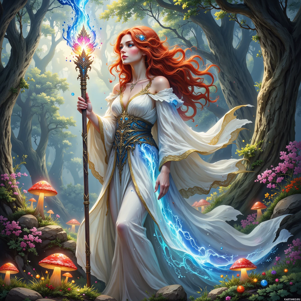 На картинке молодая женщина с длинными рыжими волосами и белой одеждой, украшенной синими деталями, стоит в лесу. В правой руке она держит посох, из которого вырывается молния, словно она колдует – об этом говорит свечение на кончиках её пальцев. Вокруг неё – пышная зелень, а на земле разбросаны грибы разных размеров. Её взгляд направлен на что-то, чего не видно на картинке, создавая ощущение сосредоточенности или, возможно, взаимодействия с чем-то за её пределами.