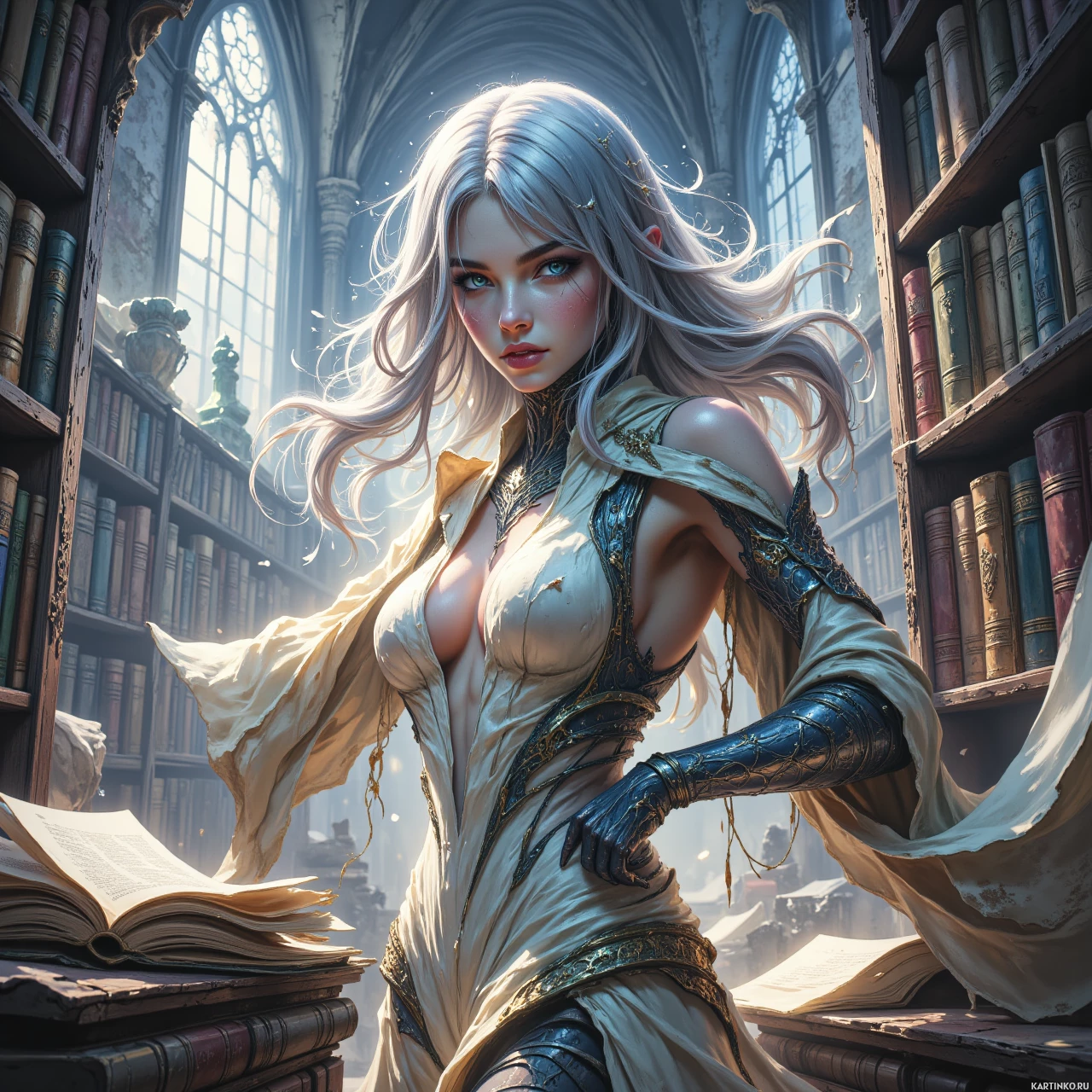 На картинке изображена женщина с белыми волосами. Она стоит в роскошной комнате, похожей на библиотеку или кабинет, судя по многочисленным книгам и свиткам вокруг неё. Её наряд намекает на фэнтезийный сеттинг, возможно, она ведьма или колдунья. Общий стиль картинки подвергся цифровой обработке, придающей ей живописность и драматичное освещение, подчеркивающее неземную атмосферу сцены.
