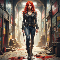 На картинке изображена девушка с рыжими волосами, растрепанными так, будто она пережила немало испытаний или приключений. На ней черная кожаная куртка поверх темной рубашки, джинсы и ботинки. Её осанка уверенная и напористая, она решительно идет по узкому переулку или улице. Окружающее пространство выглядит заброшенным и обветшалым, с разбитыми указателями и мусором на земле. Присутствует и ощущение опасности, намекнутое лужей крови перед ней.