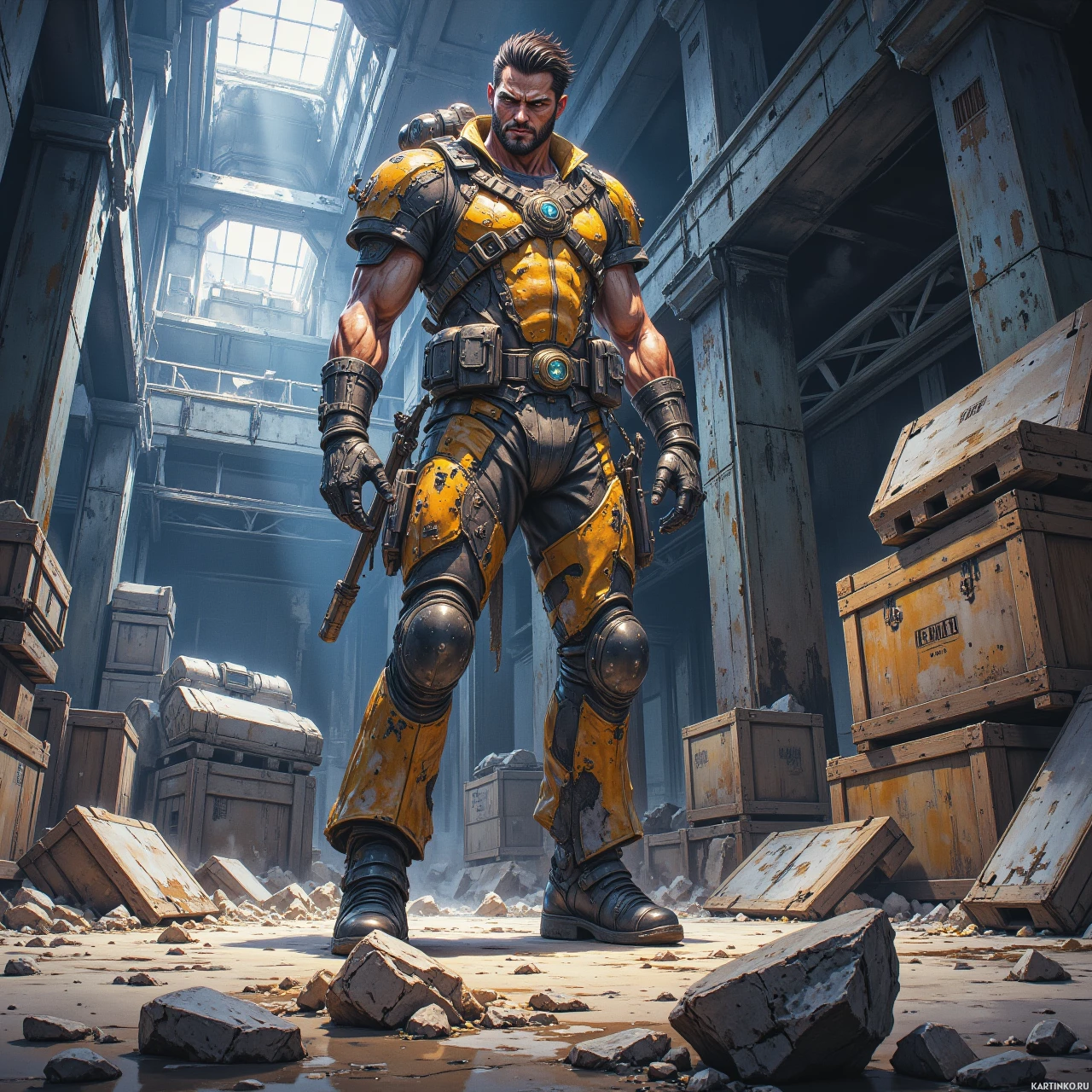 На картинке – мужчина в футуристических доспехах, стоящий в индустриальном или складском помещении. На нём жёлто-чёрный костюм с наплечниками, а на поясе закреплены заряды оружия. Его поза выдаёт готовность к действию и настороженность. Вокруг – горы контейнеров и разбросанный мусор, свидетельствующие о беспорядке или недавней активности. Место действия – научно-фантастический сеттинг, возможно, часть подземного объекта или складское помещение в рамках крупного промышленного комплекса.