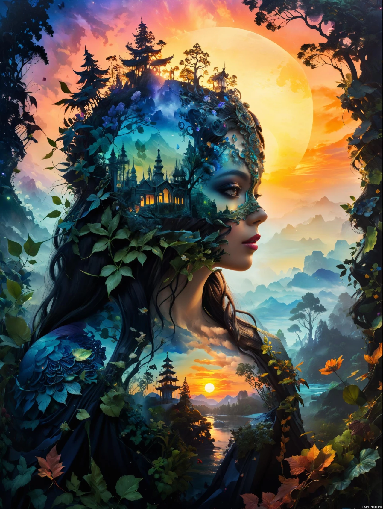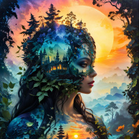 warm hues illuminating the scene. Amidst the trees and foliage, there are hints of human settlements such as buildings nestled in between the natural elements. The overall atmosphere of the image suggests a theme of nature merging with the fantastical or mythological, as indicated by the silhouette-like integration of trees and structures within her profile silhouette. The artist has paid close attention to color gradients and lighting effects to create a serene yet magical ambiance.