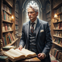 На картинке изображен мужчина, стоящий в старинной библиотеке или книжном магазине. На нем строгий костюм, галстук и очки, что придает ему интеллектуальный вид. Волосы аккуратно причесаны, на лице серьезное выражение, словно он глубоко задумался или увлечен открытой книгой в руках. Вокруг множество книг, создающих атмосферу богатой коллекции знаний. Теплый свет, проникающий сквозь витражные окна, добавляет этому месту научный шарм.
