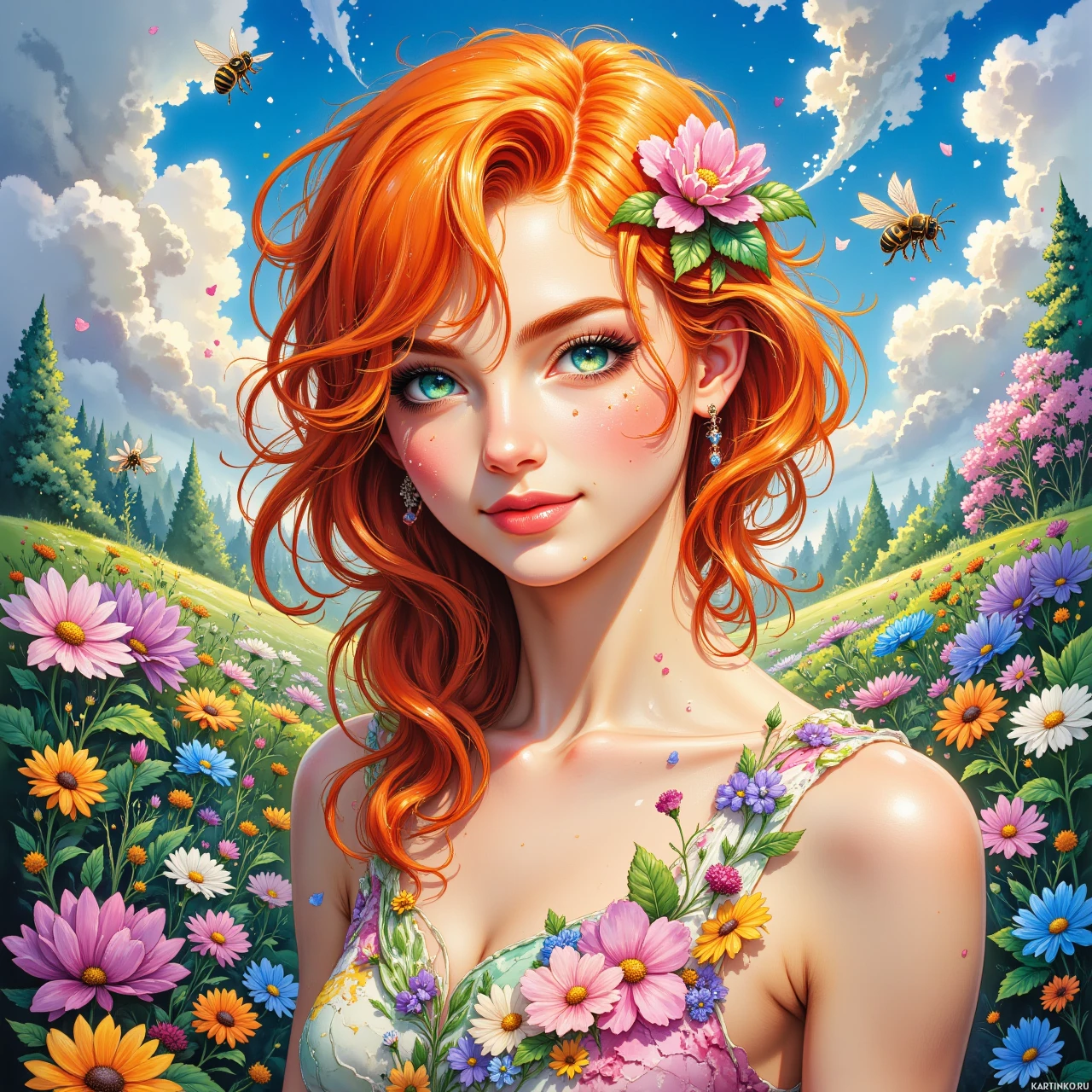 На картинке изображена сказочный персонаж, похоже, молодая девочка с рыжими волосами и выразительными голубыми глазами. У неё нежная, румяная кожа и, кажется, цветочный венок или корона, украшенная цветами. Выражение её лица мягкое и немного мечтательное, с приоткрытыми губами, как будто она слегка улыбается. На заднем плане – множество разноцветных полевых цветов в оттенках синего, жёлтого и розового, а также зелёная листва. Небо над ней окрашено в светлые тона, намекающие на рассвет или закат, с мягкими облаками. Среди цветов видны небольшие насекомые или пчёлы, добавляющие жизни в сцену. В целом, картинка вызывает чувство спокойствия и природной красоты.