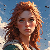 a contemplative expression on her face, suggesting she is deep in thought or perhaps observing something of interest. The style of the artwork suggests it could be from