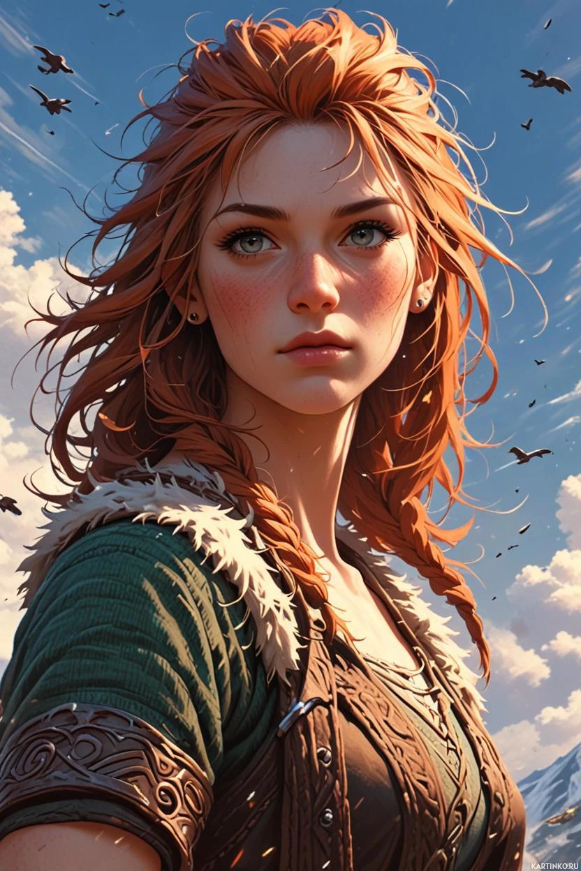 a clear sky and some scattered birds, which allows the focus to remain on the character herself.