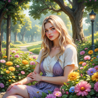 In the image, there is a young woman with long blonde hair who appears to be in a contemplative or reflective pose. She is seated on what looks like a stone bench surrounded by a lush garden filled with various types of flowers. The colors in the image are vibrant and naturalistic, suggesting an outdoor setting during what could be late spring or early summer, given the abundance of blooms. The style of the illustration suggests it might be digital artwork designed to evoke a sense of tranquility or idyllic leisure time in a garden setting. The image is likely intended to convey beauty and peacefulness, capturing the essence of the young woman amidst the natural surroundings.