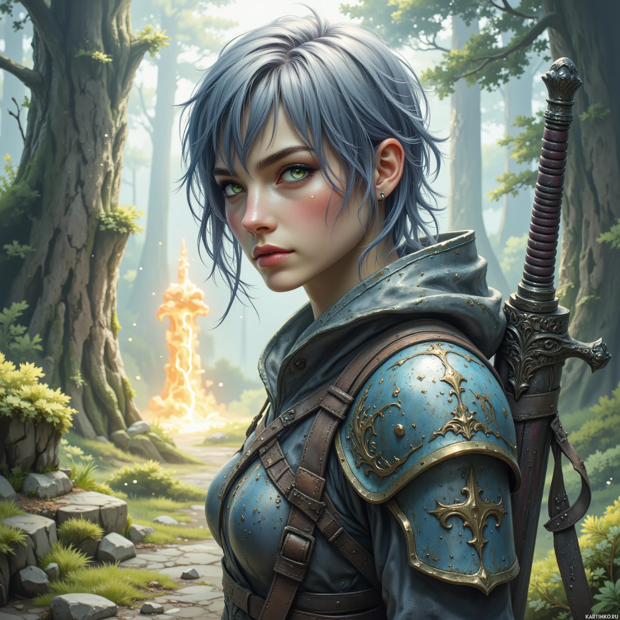 Картинка с воительницей: у неё короткие синие волосы и серьёзное выражение лица. Она одета в средневековые доспехи с замысловатыми узорами, у пояса меч. На заднем плане – густой лес с высокими деревьями, поросшими мхом камнями и мерцающим светом, словно откоса вдали.