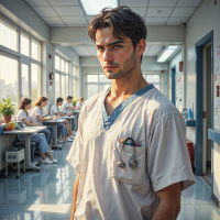 На картинке молодой человек стоит в помещении, похожем на медицинское или учебное заведение, судя по наличию парт и других людей в белых халатах. Он смотрит прямо в камеру с нейтральным выражением лица. У него короткие темные волосы и очки. На нем белый халат, а на шее - наушники стетоскопа, что указывает на его профессиональную медицинскую деятельность. Свет свидетельствует о дневном времени суток, а за спиной видны частично задернутые шторы. В целом атмосфера обстановки спокойная и организованная.