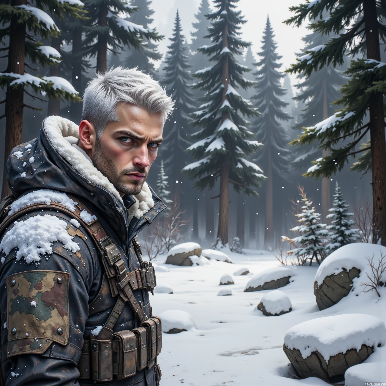 На картинке мужчина стоит посреди заснеженного леса. У него короткие волосы, и он одет в теплую зимнюю одежду, включая, кажется, утепленную куртку с поднятым капюшоном. На заднем плане видны ели, создающие зимнюю атмосферу. Его выражение лица серьезное, что говорит о сосредоточенном или напряженном моменте. Общий стиль картинки передает драматичную и напряженную атмосферу, характерную для промо-материалов видеоигр или подобных медиа.
