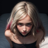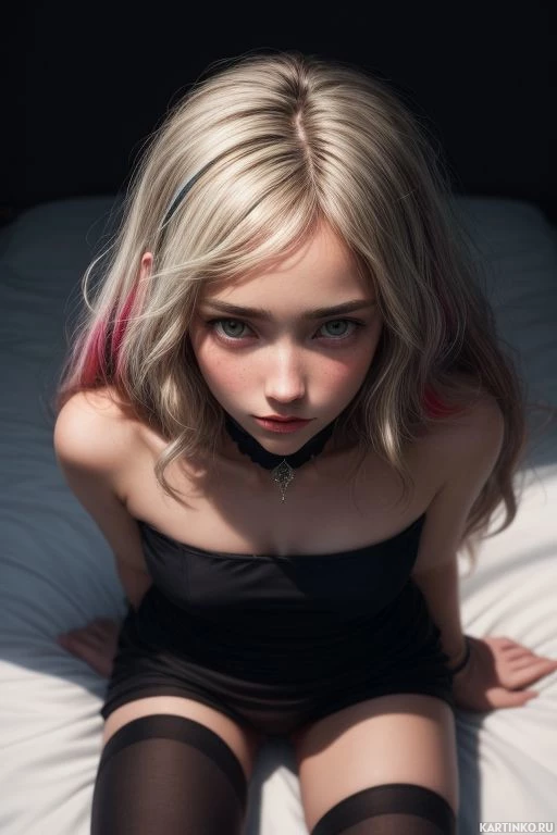 black lingerie or underwear with black stockings and a choker. Her pose is suggestive as she leans against a pillow on a bed. There's an artistic quality to the image, indicating it could be part of a digital illustration or