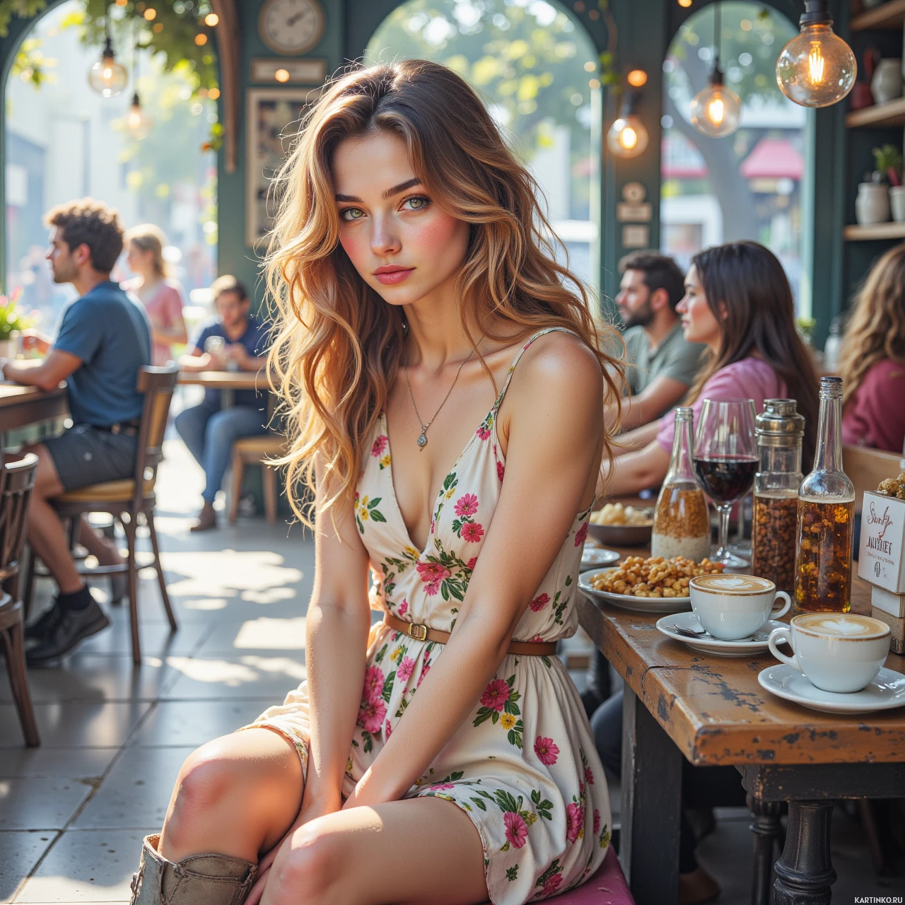 На картинке молодая женщина с длинными светлыми волосами сидит за столиком в уличном кафе. На ней платье с цветочным принтом, а на лице – мягкое выражение. Перед ней стоят две чашки, словно она наслаждается напитком. На заднем плане виднеется оживлённая улица с другими людьми, сидящими за столиками кафе, создавая непринужденную и расслабленную атмосферу.