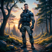 На картинке запечатлен персонаж, похожий на оперативника или солдата, на фоне леса, залитого теплым светом рассвета или заката. На нем тактическое снаряжение: шлем с визором, бронежилет и, кажется, броня под формой, на которой видны карманы для экипировки. Он расслабленно держит два пистолета у себя при боку. На плечах рюкзак, а на ногах – тактические ботинки. Персонаж стоит на тропинке, уходящей вглубь леса, впереди виднеется поляна, где солнце едва поднимается над горизонтом. Почва покрыта травой, а по обеим сторонам тропинки растут небольшие растения. Листва на деревьях густая, что говорит о здоровой лесной экосистеме. Стиль картинки – детализированный и реалистичный, с акцентом на свет и тень для создания гнетущей атмосферы.
