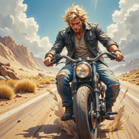 На картинке мужчина на мотоцикле в пустыне. У него взъерошенные светлые волосы, и он одет в кожаную куртку. Он словно смотрит влево, пока едет по песчаной дороге, проложенной через пустынный пейзаж. На заднем плане видны скальные образования и растительность, что указывает на суровую местность. Картинка выполнена в живописной манере, что придает ей художественный, а не реалистичный характер.