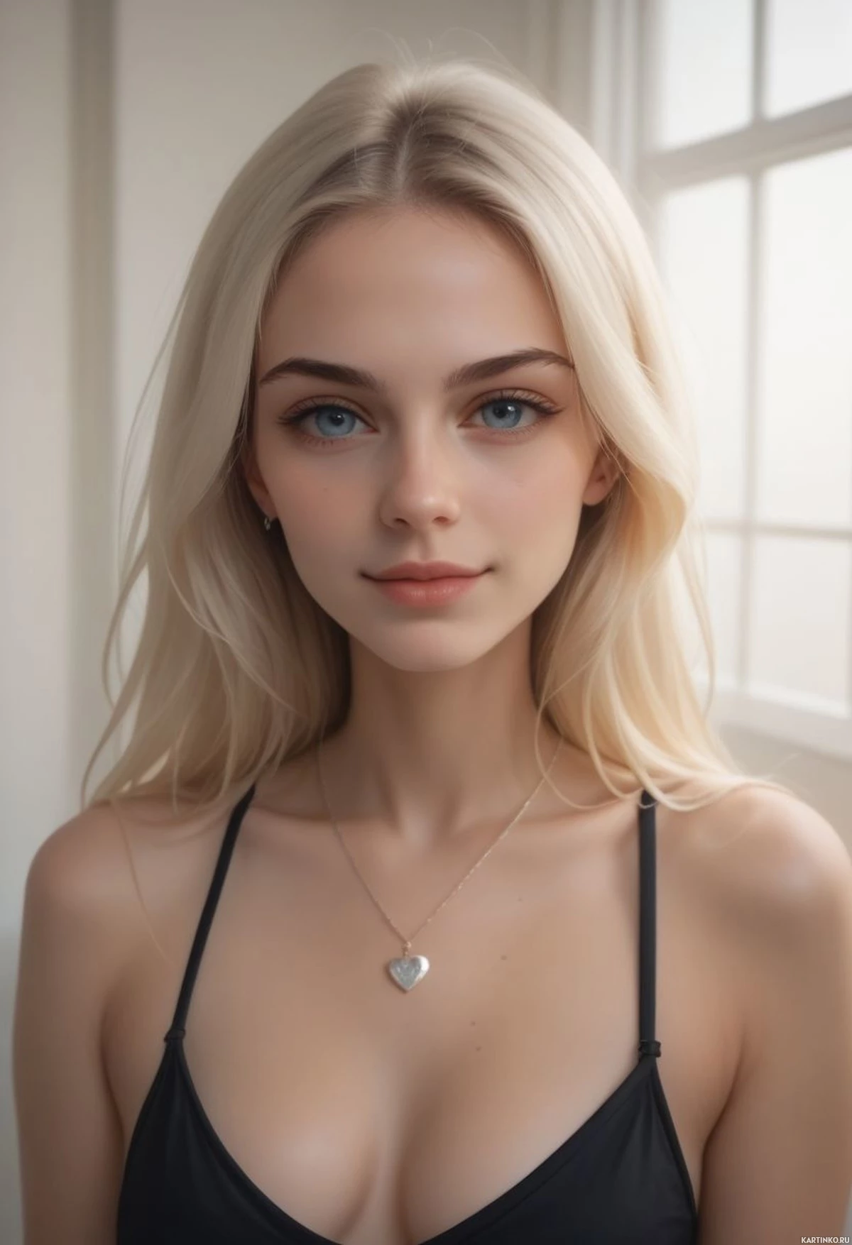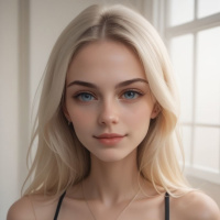a young woman with blonde hair and striking blue eyes. She has
